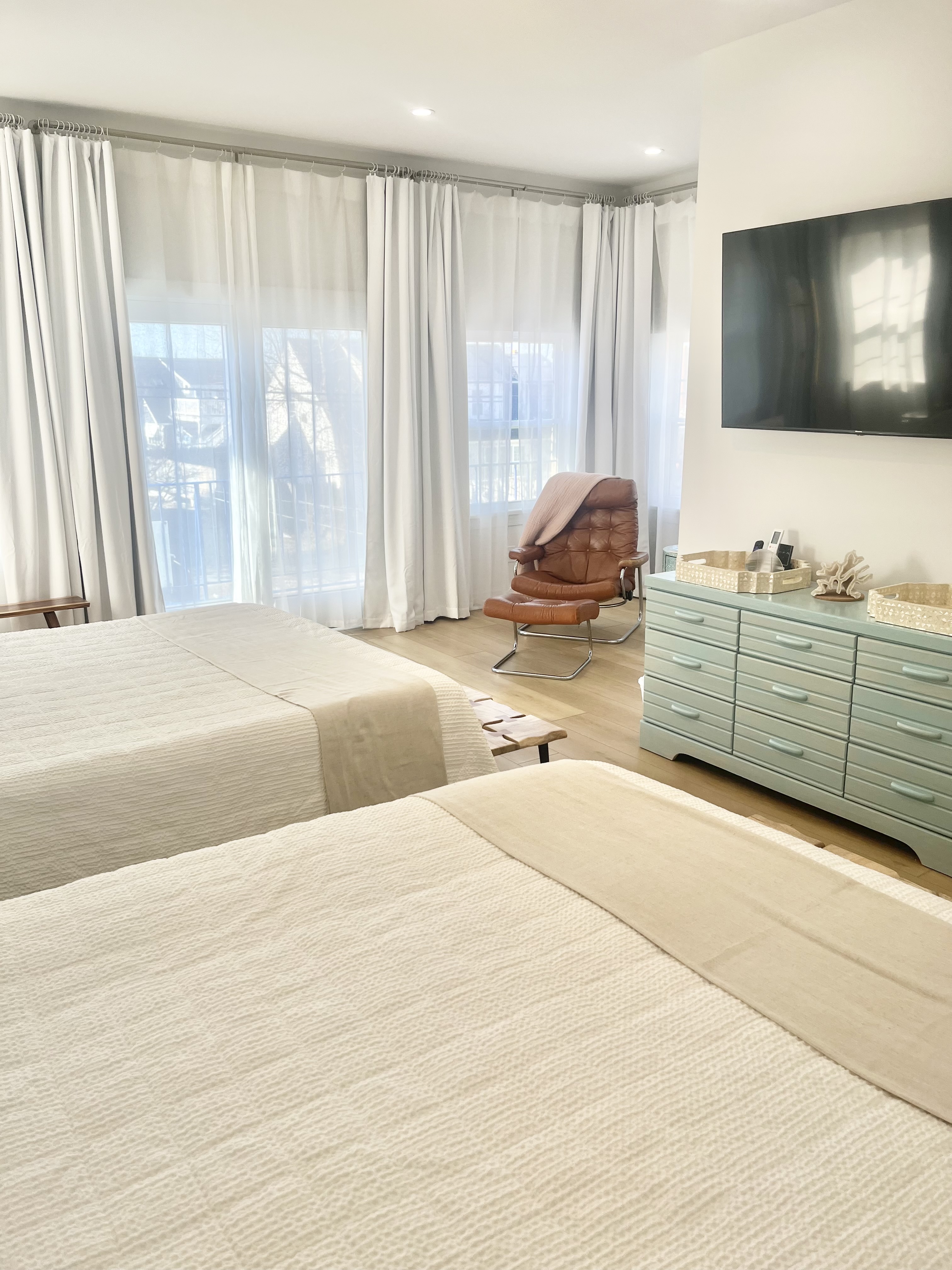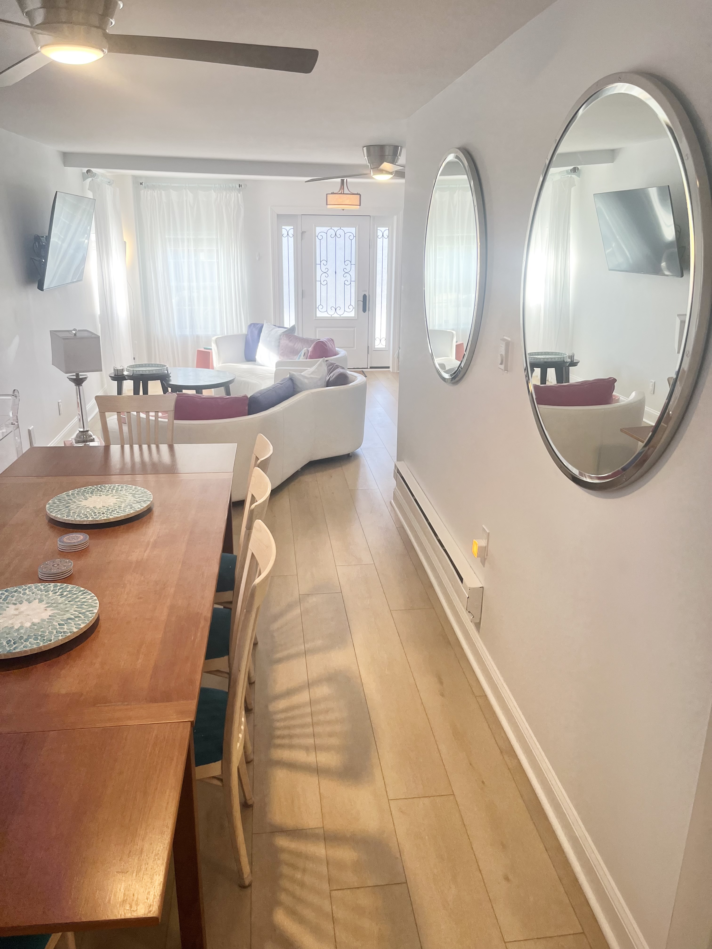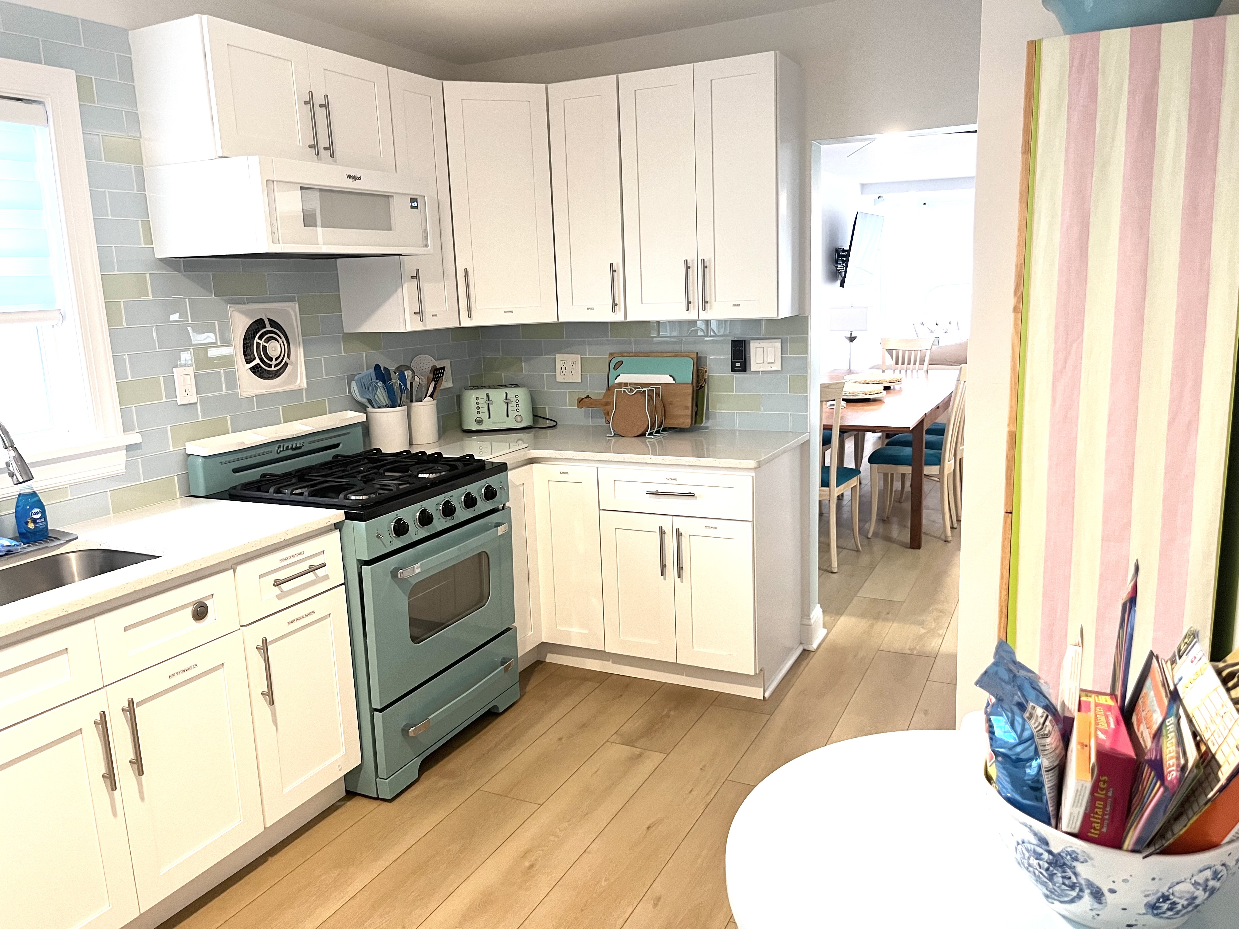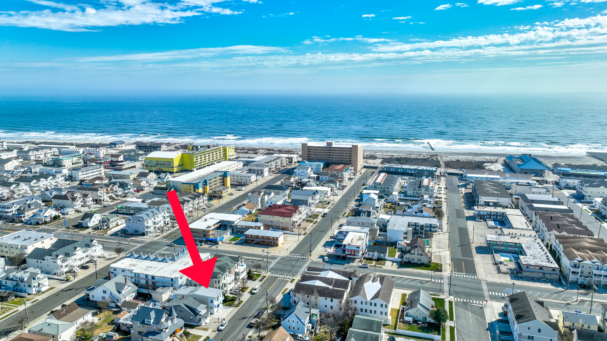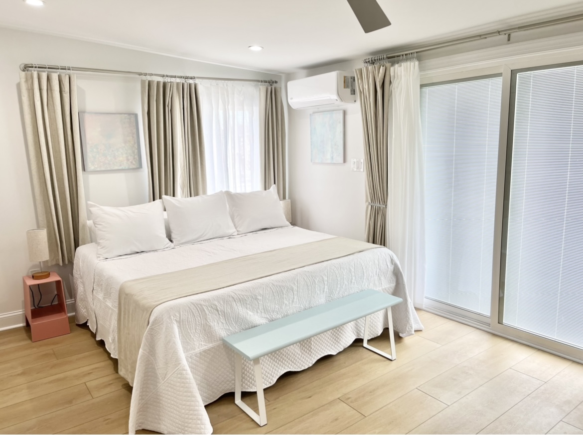Perfect for two families or a large group to stay with plenty of room to gather - and plenty of room for privacy as well. This gorgeous 4 bedroom/3 bathroom house is located on one of the most desirable streets in North Wildwood and is just over a block from the beach and boardwalk! Two primary bedrooms upstairs, one King that opens to a large outdoor deck, and one massive primary suite with two Queen beds and a balcony with an Ocean View. Each has an attached luxury spa bathroom that you have to see to believe! There are two bedrooms on the main level, one with a full-sized double bed and another with a twin over double bunk bed that sleeps three people comfortably, plus an additional bathroom with an oversized tub/shower combo. Well-stocked kitchen with retro modern touches, convection oven, full-sized refrigerator and freezer, dishwasher, and all of the essentials. Spacious open concept living room and dining room with ample seating for 12 to dine-and even more to gather! Bonus office room and an exercise space for morning yoga, large screen streaming TVs in the living room and in every bedroom, and plenty of games. To make your vacation even easier, there are two washers, two dryers, an outdoor hot shower, beach carts and gear, boogie boards and sand toys, and beach chairs for you to use during your stay. Beach towels are provided as well.