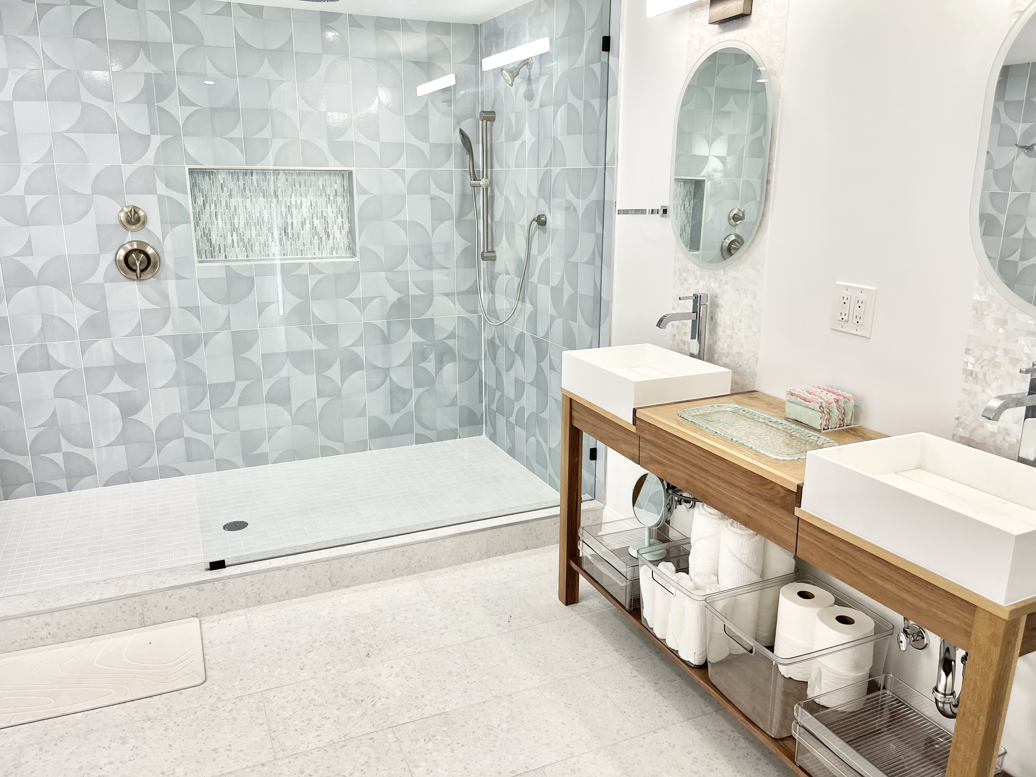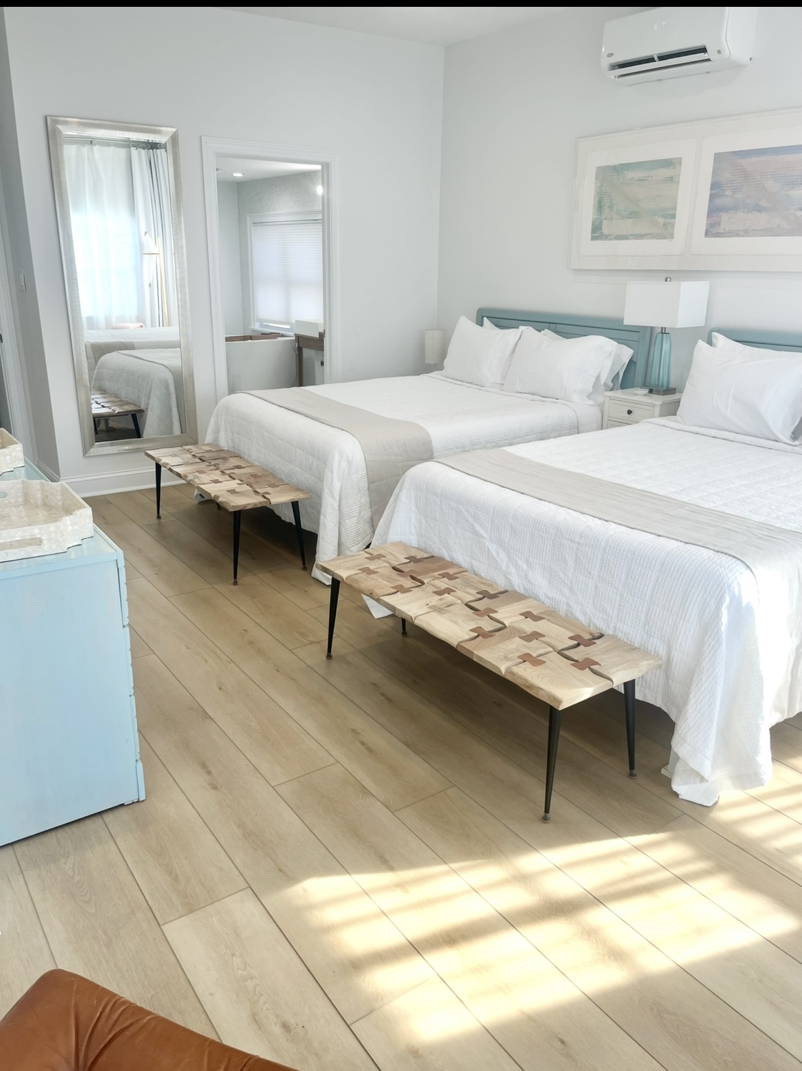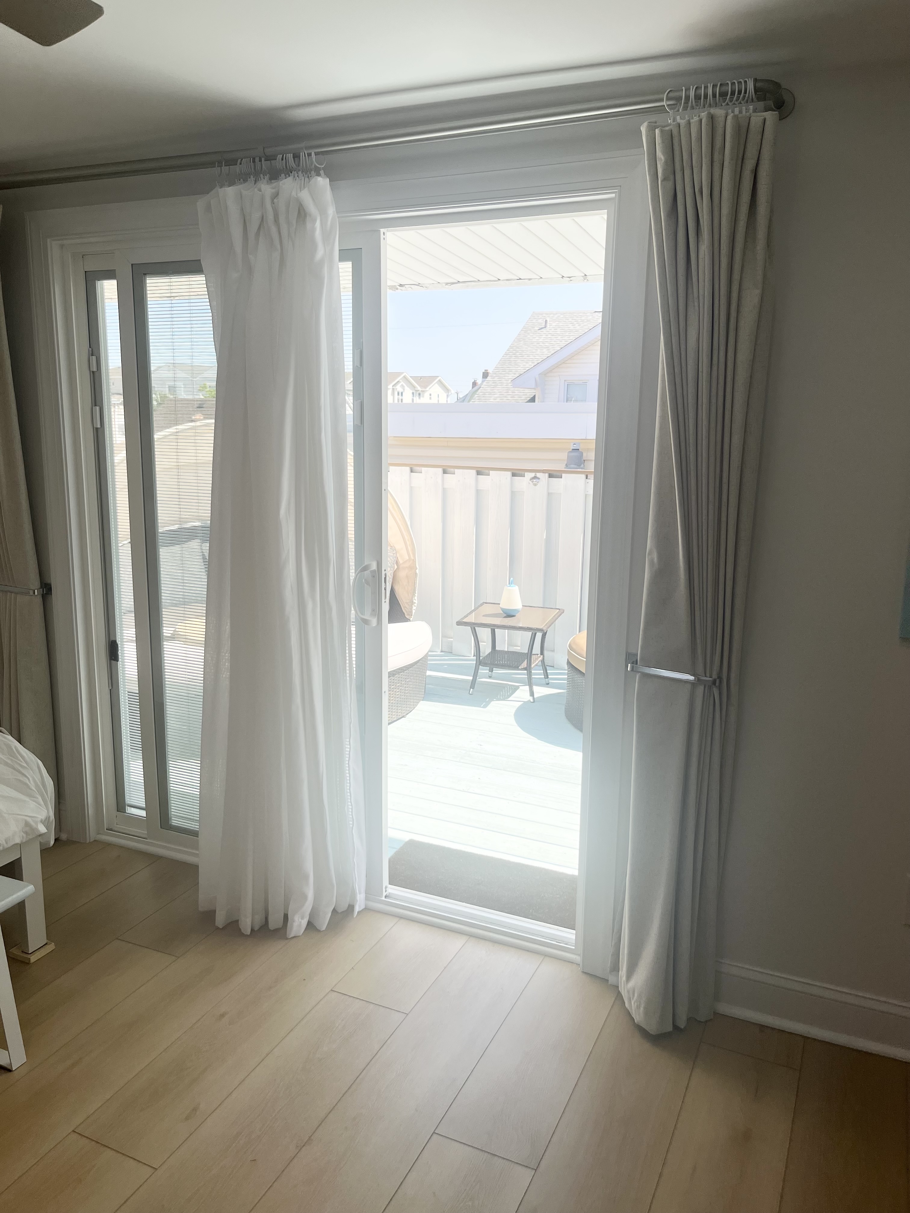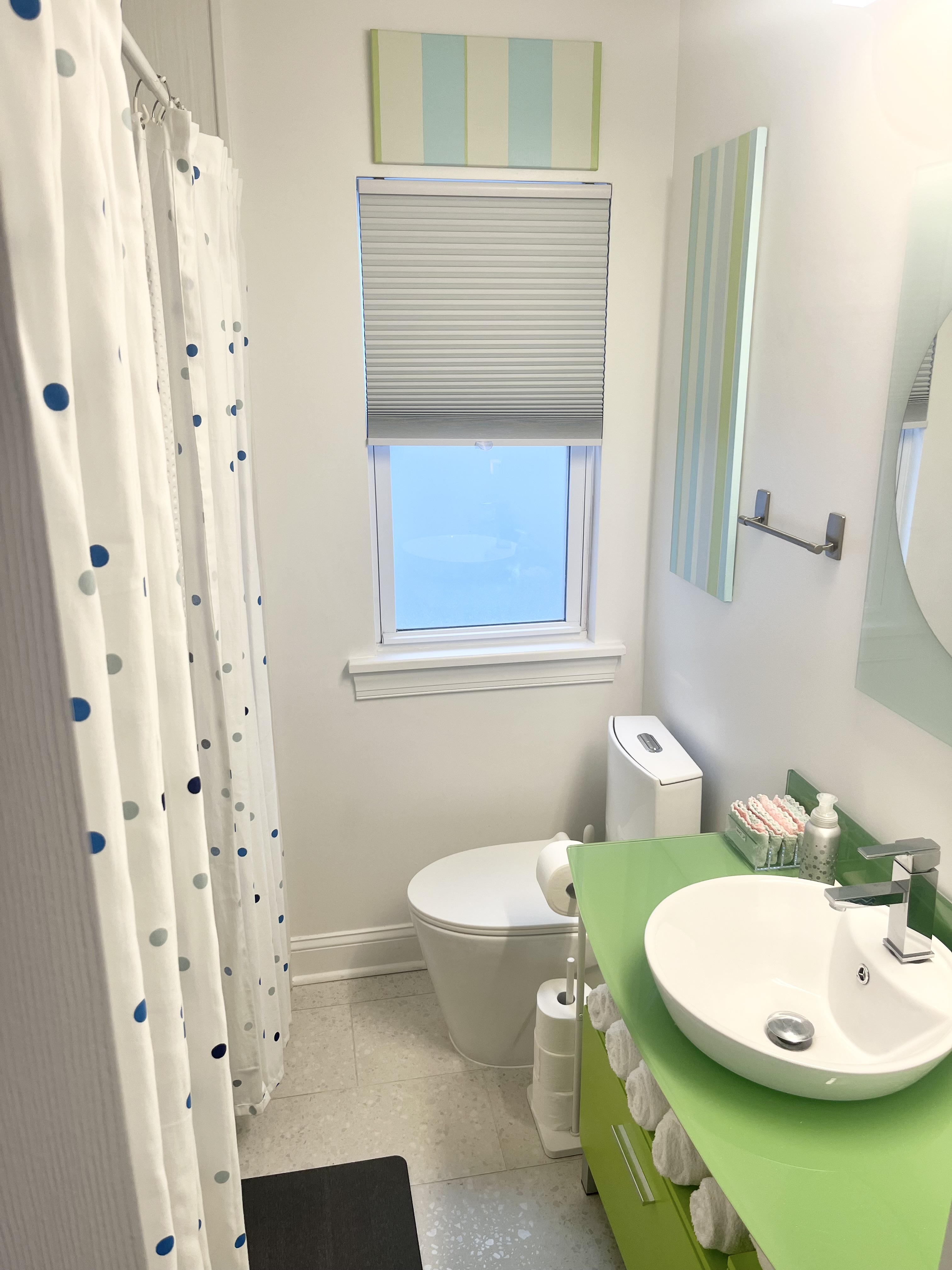 Perfect for two families or a large group to stay with plenty of room to gather - and plenty of room for privacy as well. This gorgeous 4 bedroom/3 bathroom house is located on one of the most desirable streets in North Wildwood and is just over a block from the beach and boardwalk! Two primary bedrooms upstairs, one King that opens to a large outdoor deck, and one massive primary suite with two Queen beds and a balcony with an Ocean View. Each has an attached luxury spa bathroom that you have to see to believe! There are two bedrooms on the main level, one with a full-sized double bed and another with a twin over double bunk bed that sleeps three people comfortably, plus an additional bathroom with an oversized tub/shower combo. Well-stocked kitchen with retro modern touches, convection oven, full-sized refrigerator and freezer, dishwasher, and all of the essentials. Spacious open concept living room and dining room with ample seating for 12 to dine-and even more to gather! Bonus office room and an exercise space for morning yoga, large screen streaming TVs in the living room and in every bedroom, and plenty of games. To make your vacation even easier, there are two washers, two dryers, an outdoor hot shower, beach carts and gear, boogie boards and sand toys, and beach chairs for you to use during your stay. Beach towels are provided as well.
