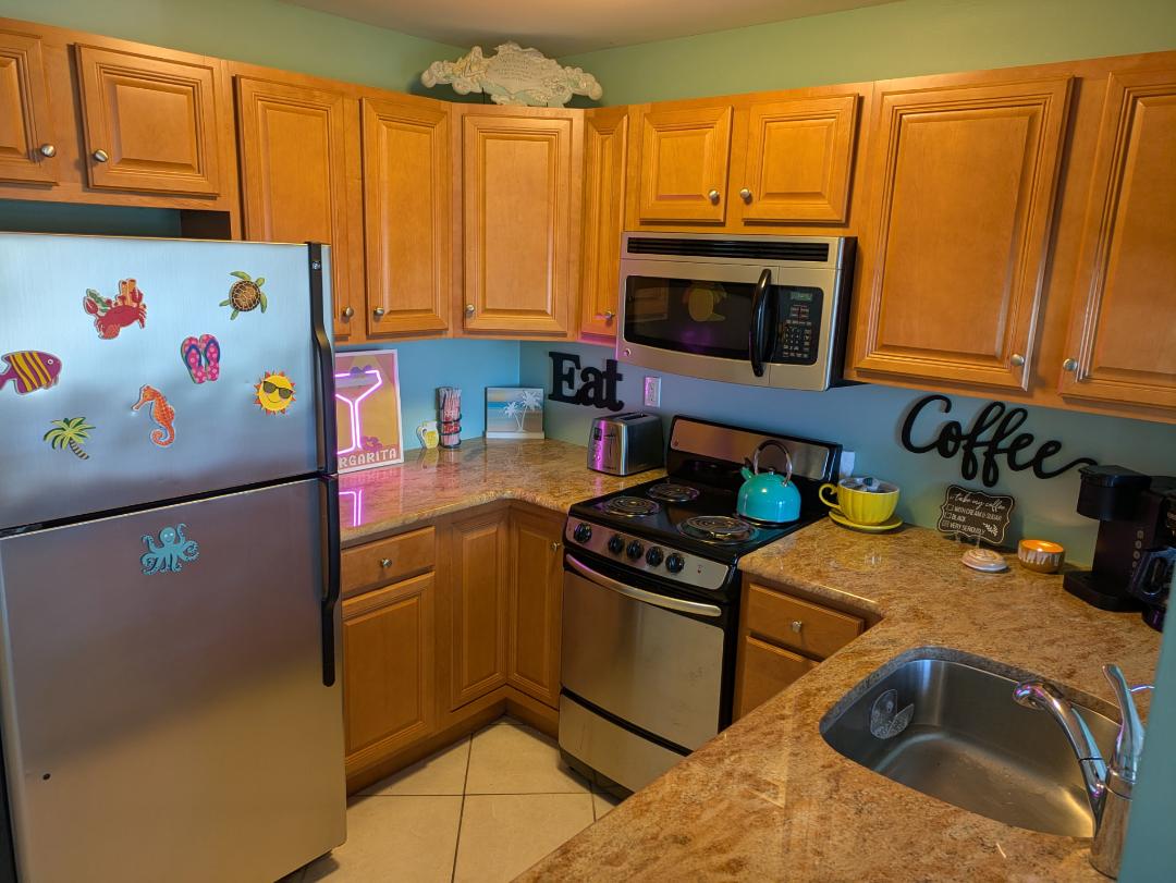 This unit has a kitchen with sink, fridge, dishwasher, stove, garbage disposal, Coffee maker--filters not provided, toaster, Keurig, basic cookware and utensils. Paper products are not provided.