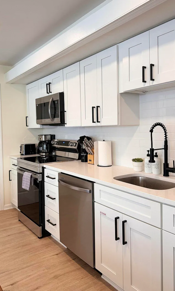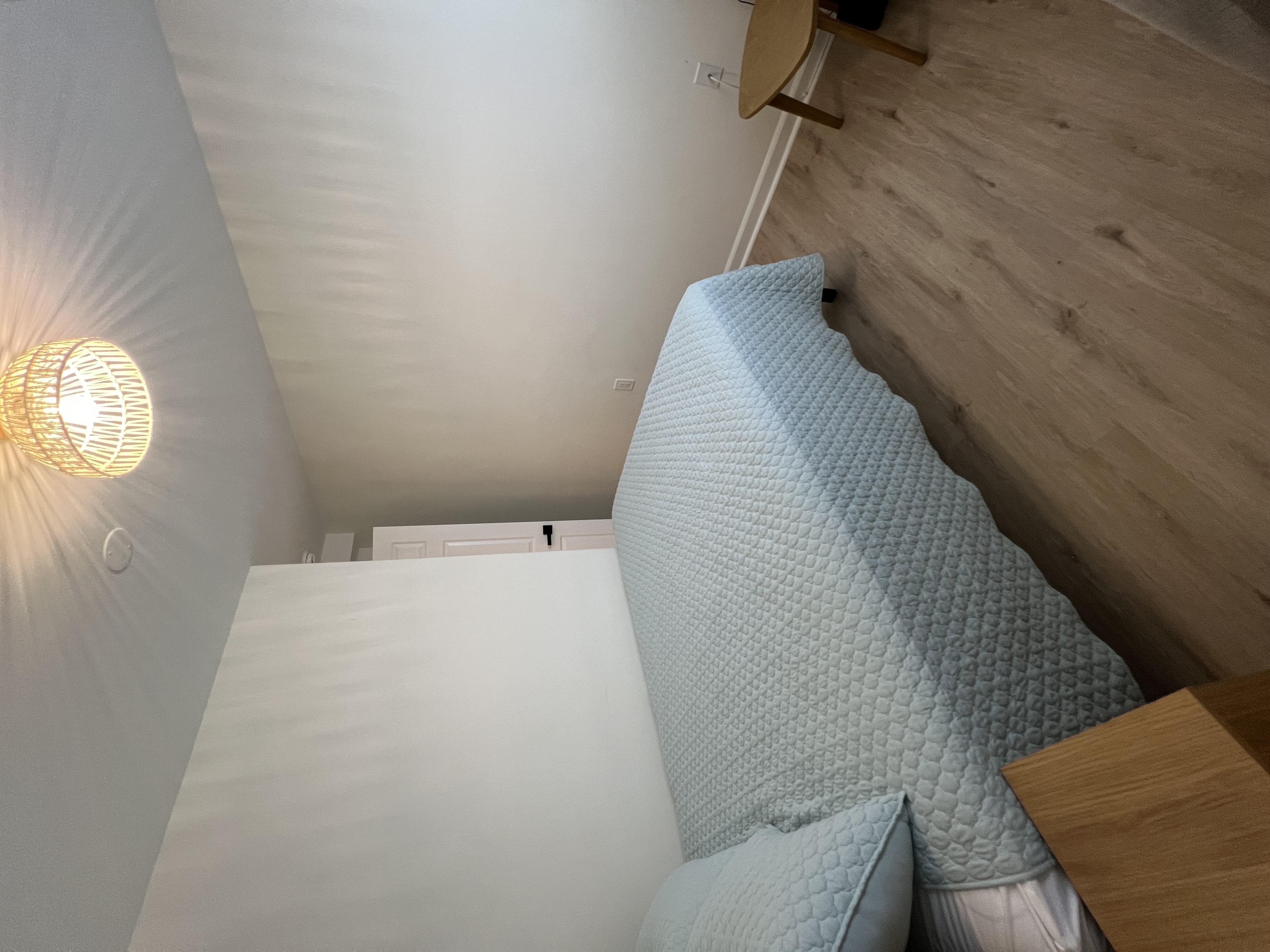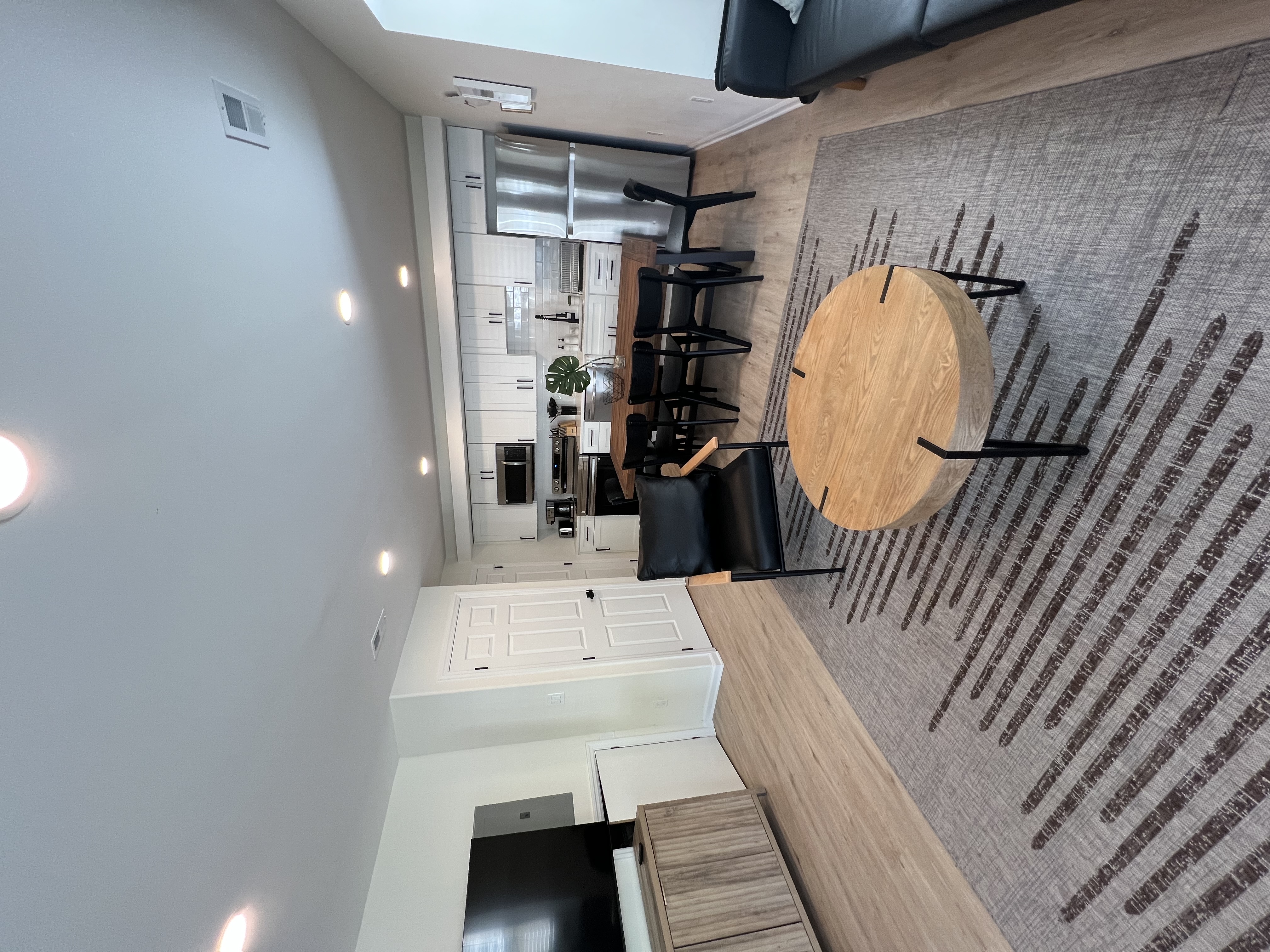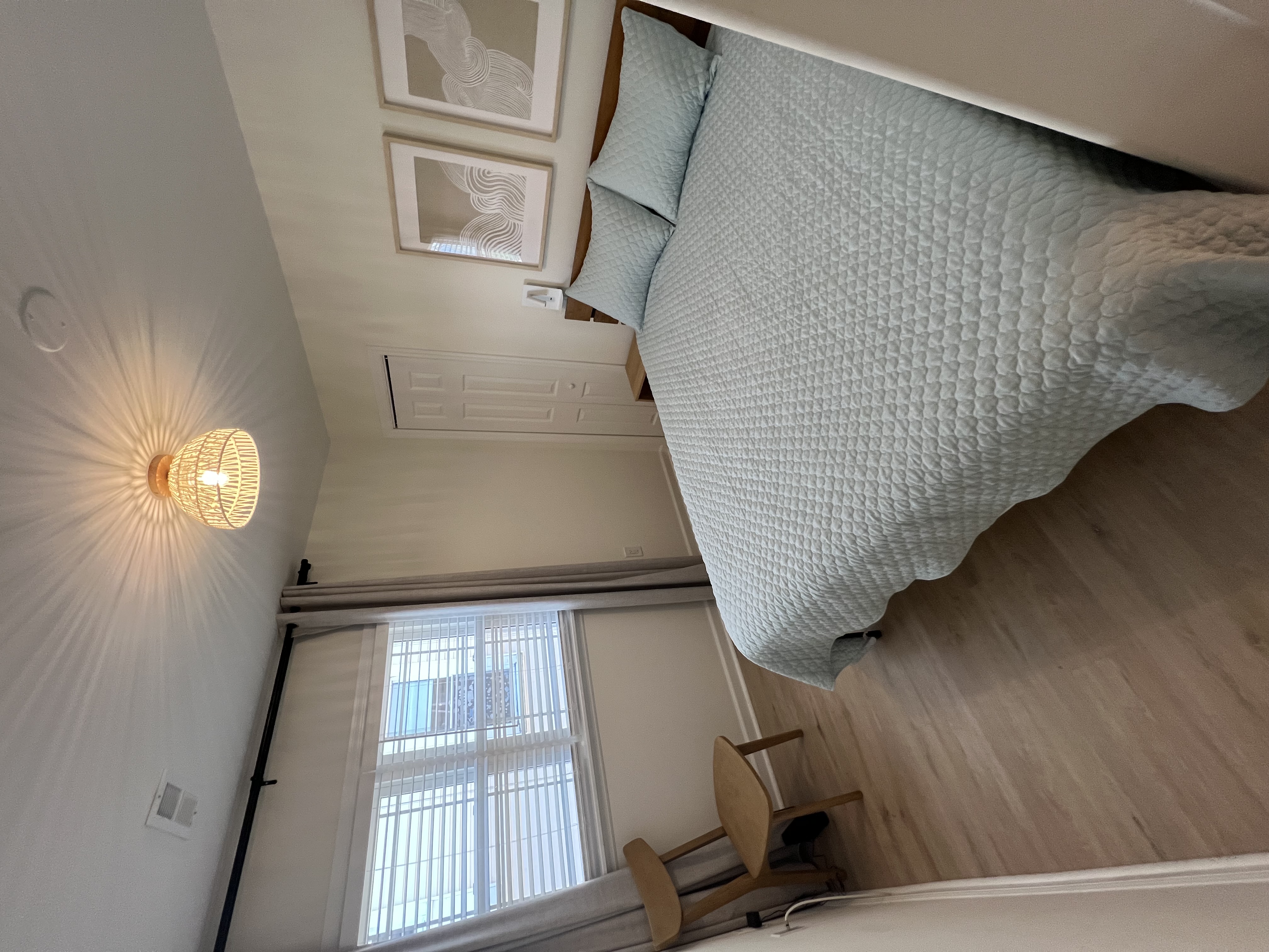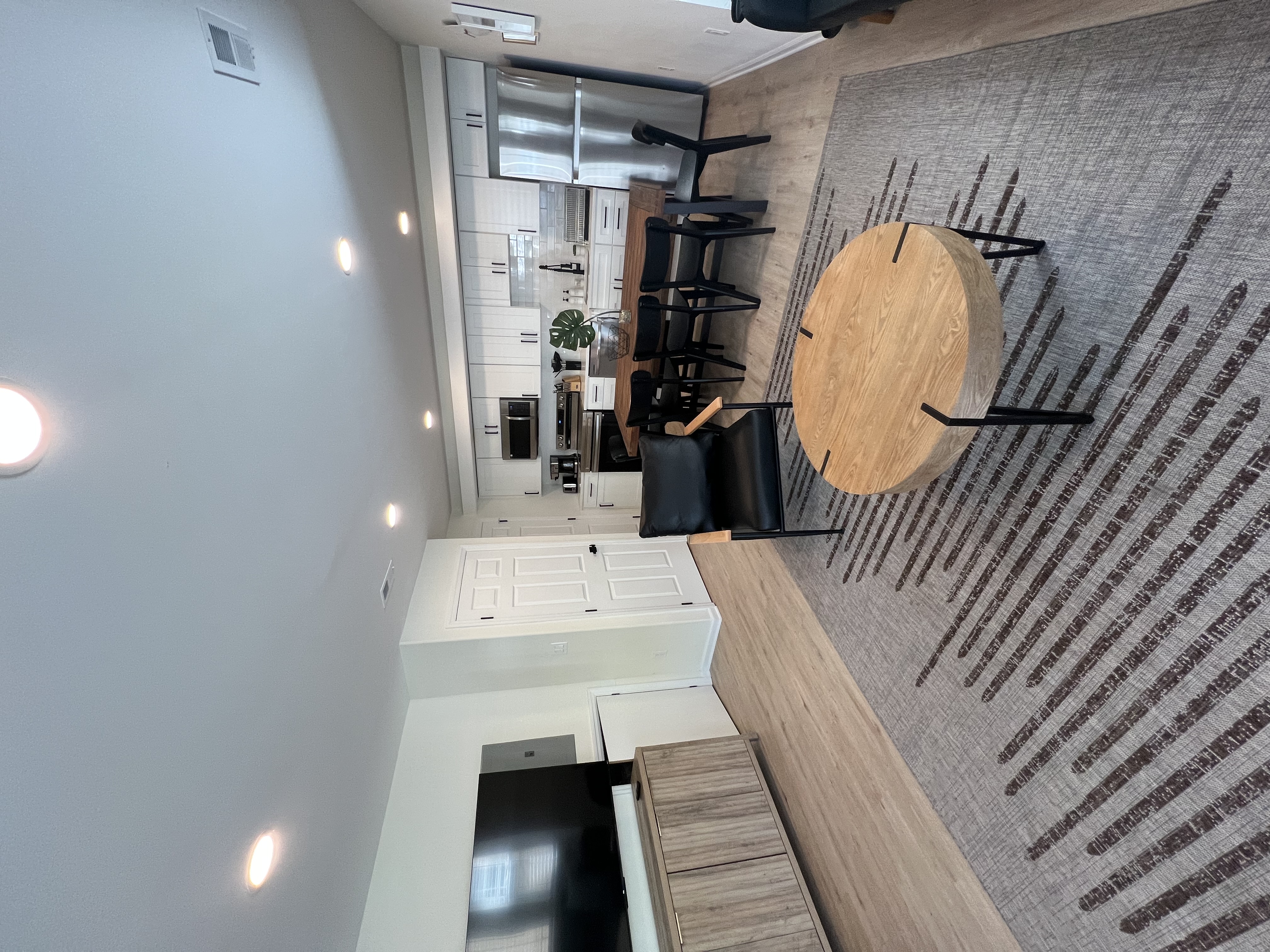Step inside to an open-concept living space that seamlessly connects the living, dining, and kitchen areas. Recessed lighting throughout the first floor creates a bright, inviting ambiance, perfect for relaxing or entertaining. The brand-new white kitchen is a chef’s dream, featuring high-grade quartz countertops with a stylish waterfall edge and chic light fixtures.