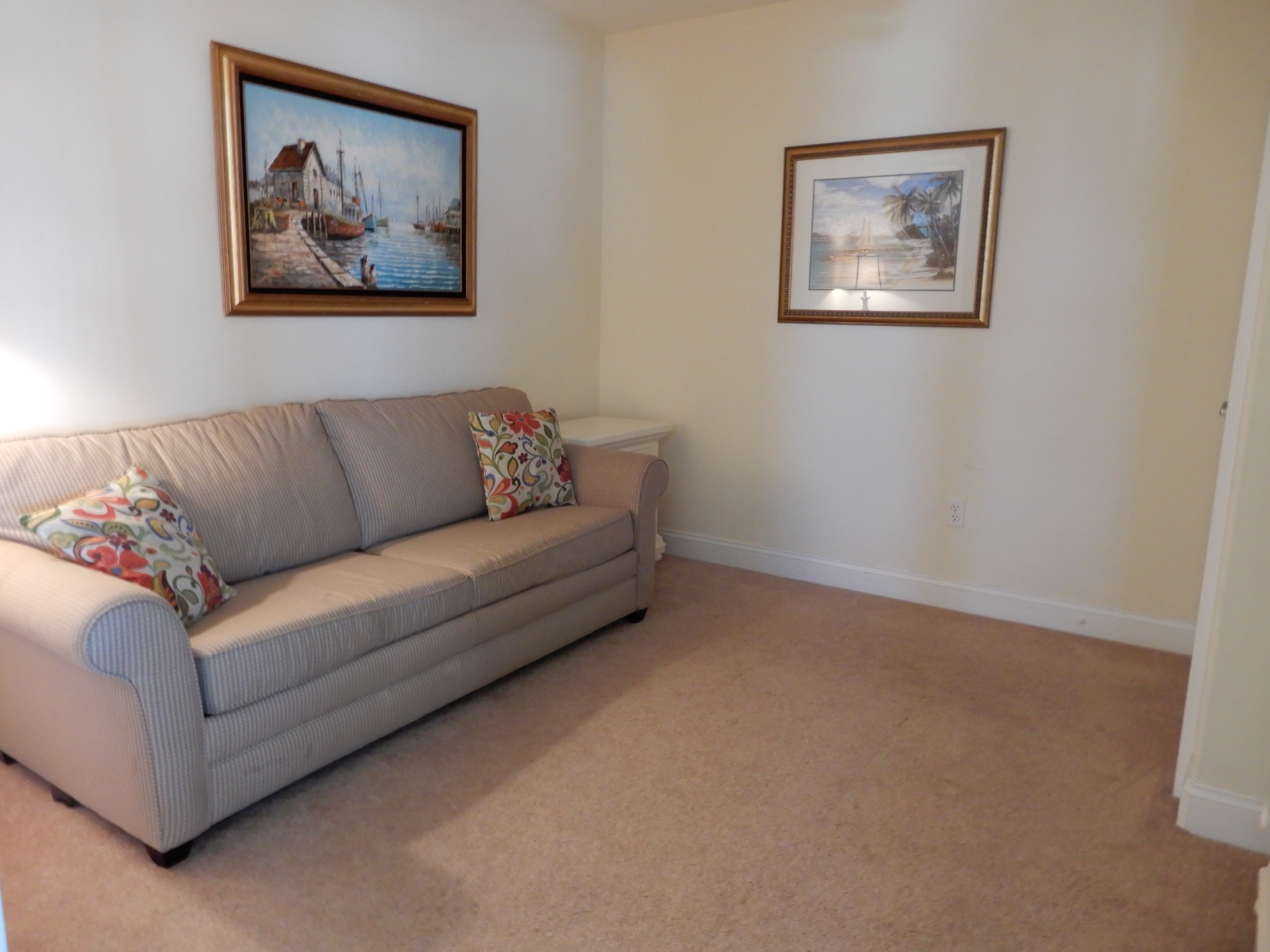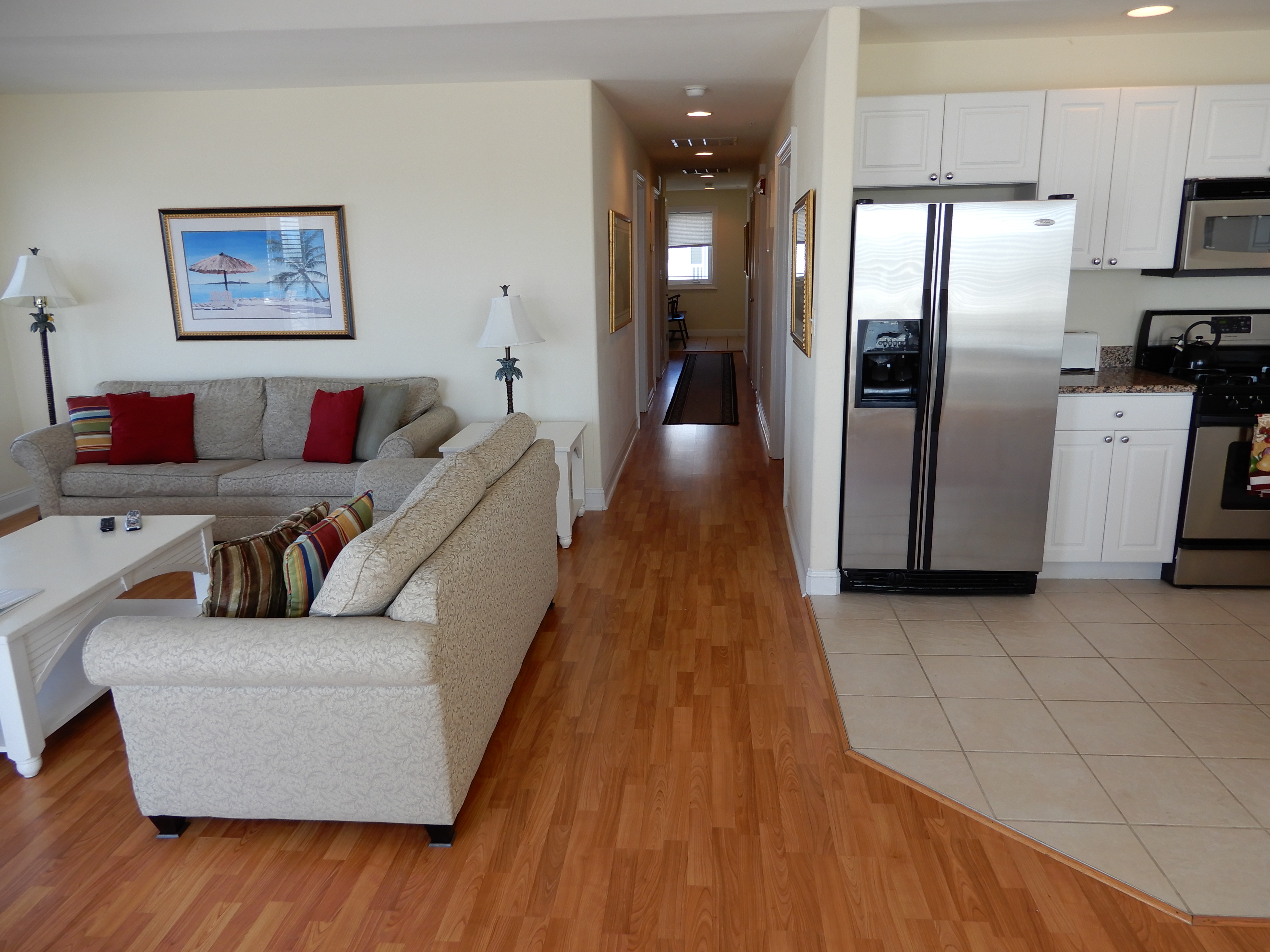 The living, dining, and kitchen "great room" area is very spacious with plenty of room for the whole family to gather together. Other amenities include interior carpeted hallways with elevator access, your own washer/dryer in a private laundry room in your unit, outdoor showers, two car reserved parking underneath the building, Comcast Wi-Fi and TV services, and a private beach storage room with beach chairs and an assortment of other items for guest use.