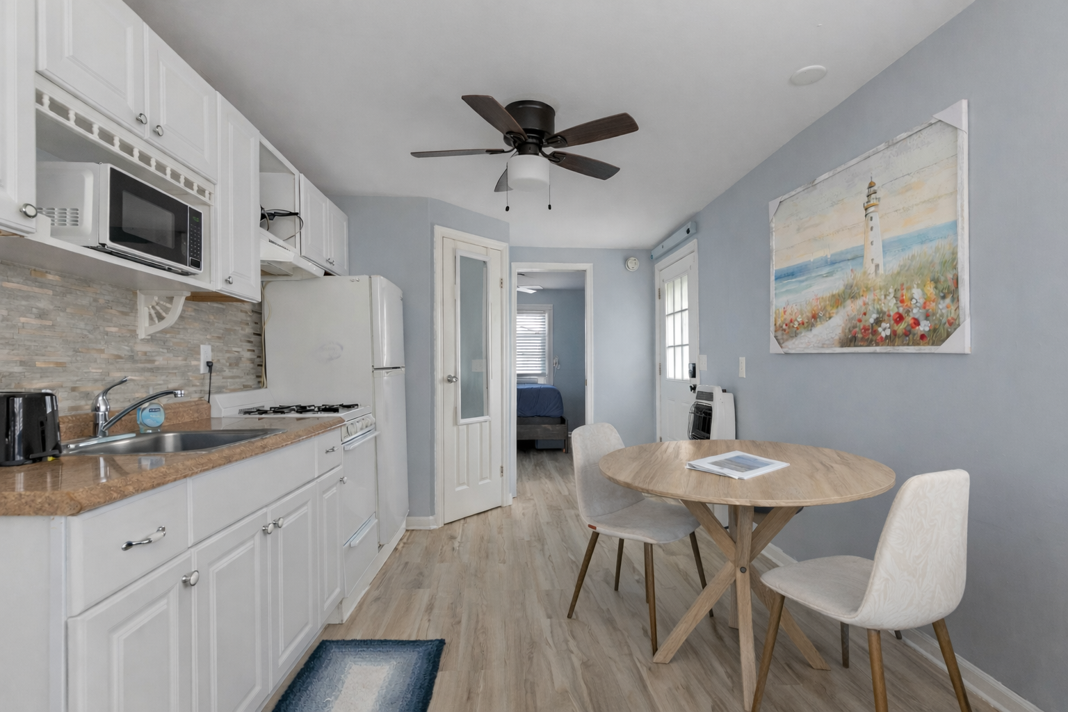 The cottage sleeps up to 3 guests, making it perfect for couples, small families, or friends looking for a cozy Jersey Shore stay.